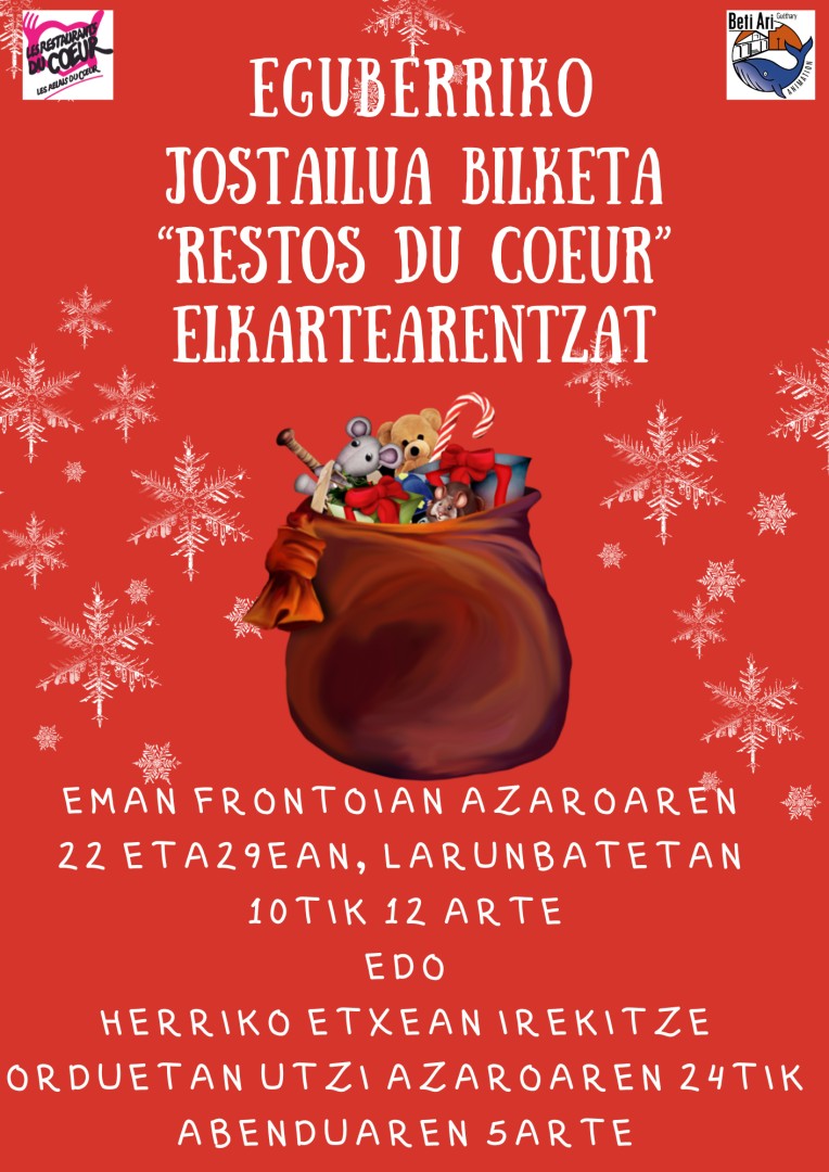 Jostailuak uzten ahalko dituzue: azaroaren 22 eta 29an (biaklarunbatak), 10:00etatik 12:00etarat pilota plazan edo Herriko Etxearen irekitzetenoreetan azaroaren 24tik (astelehena) abenduaren 5a (ostirala) arte.